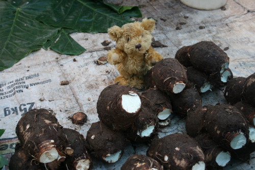 They grow fruit and vegetables. The most popular vegetable is called taro. I am standing next to some.