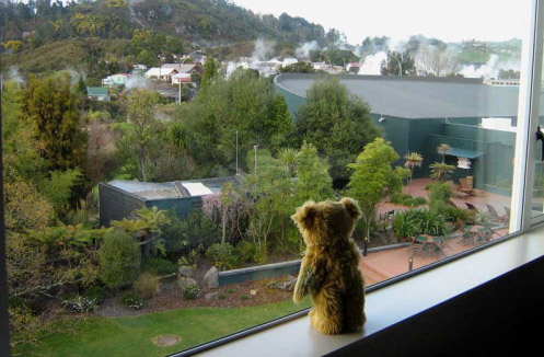 Rotorua is famous in New Zealand. It is a place where steam comes out of the ground because the hot rocks that are in the middle of the earth are closer to the surface. I could see all the steam from my hotel window.