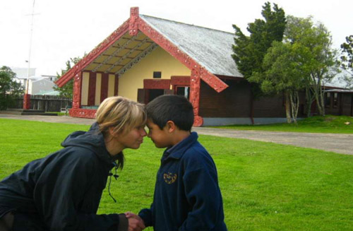In the background you can see the meeting house on the Marae. The Marae is the sacred meeting area and the house is called the whare runanga.