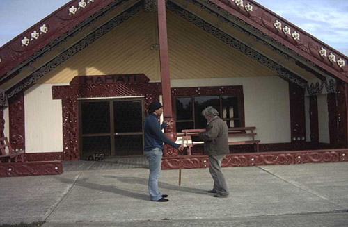 Richard is standing outside the meeting house on the Marae. This is where all the people get together for special occasions.